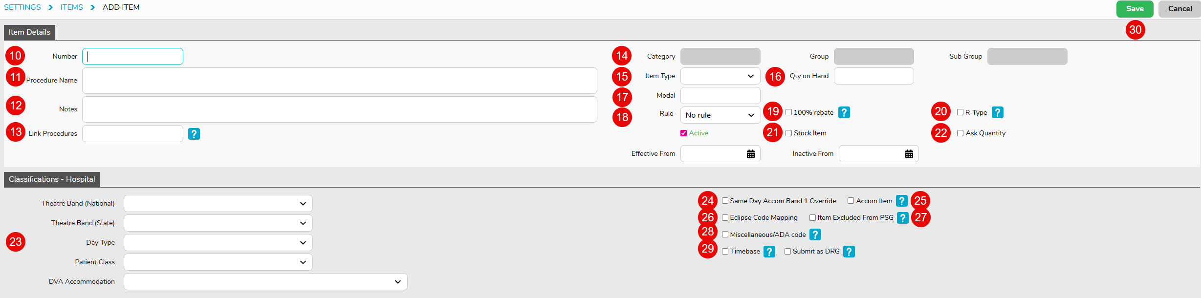 Use the following to ensure the item is classified correctly, according to the relevant banding & accommodation types: – Theatre Band (National) – will be updated by FYDO automatically – Theatre Band (State) – Day Type – will be updated by FYDO automatically – Patient Class – will be updated by FYDO automatically – DVA Accommodation