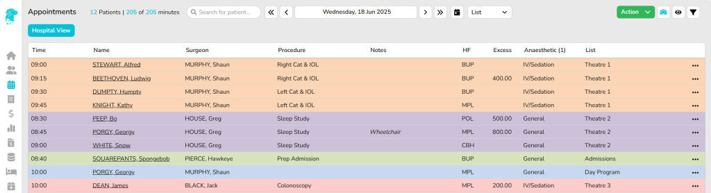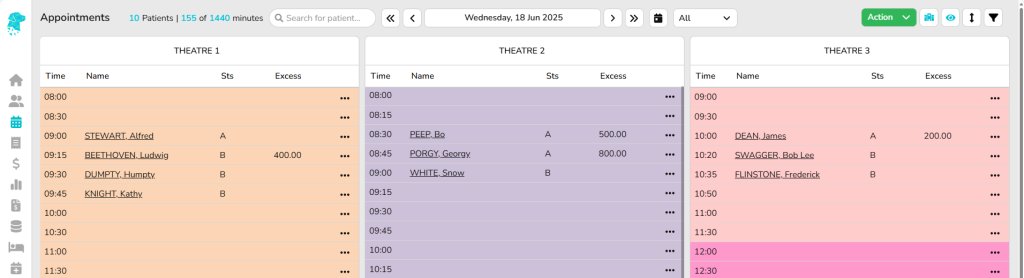 To manage your daily tasks – such as Printing Lists, Sending Bulk SMS Messages, List Re-ordering, or Adding Patients to the Waitlist, simply use the green dropdown menu labeled Action.