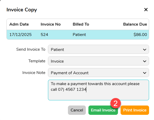 2. Select the Invoice options as usual and click on the ‘Email Invoice’ button