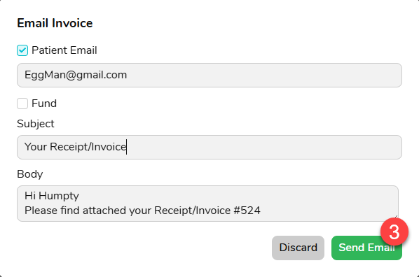 3. Select who you’d like to email, whether it be the Patient or Fund, modify the Email Subject and Body of the email if necessary and click on the ‘Send Email’ button