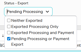 • Status – Export – This is a filter that allows you to filter which batches you see on this screen. You are also able to re-export batches by selecting the appropriate filter
