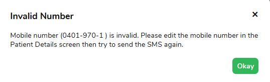 When sending an individual SMS to a patient with an invalid phone number entered, FYDO will trigger a pop-up notification to ensure the user is aware that the SMS cannot be sent.