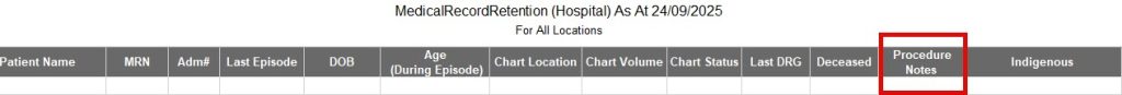 In the Medical Retention Record section under Reports, a new column has been added to the export functionality. When exporting this document to Excel, you will now see a dedicated column displaying the procedure notes.