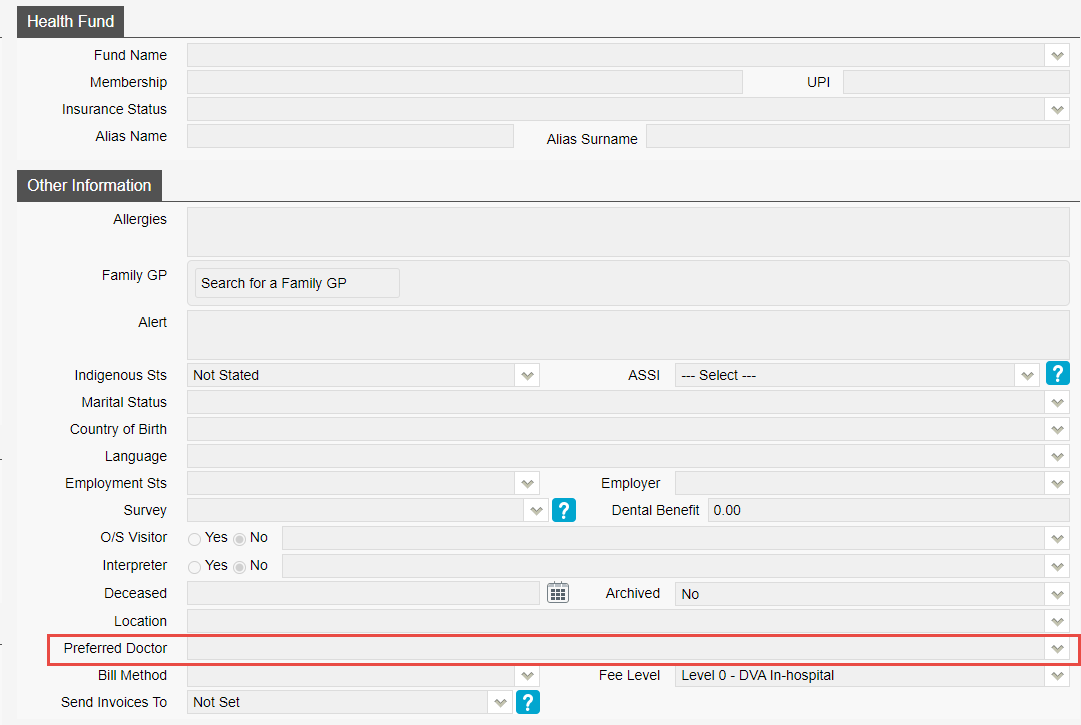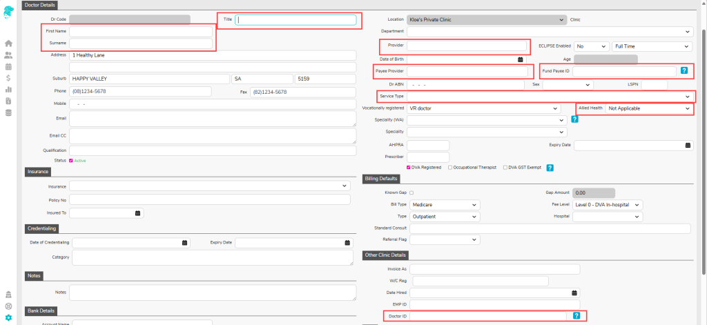 Then, add the doctor details. The key details are the doctor’s name, provider number, payee provider number, fund payee ID (if applicable), service type and Allied Health (if applicable). If you are using Claims Import, you must also ensure that the Provider Number is entered in the Doctor ID field.