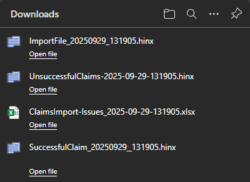 - ClaimsImport-Issues – A copy of any claims with issues in an .xlsx format. As above, you will not see this if all your claims were successful