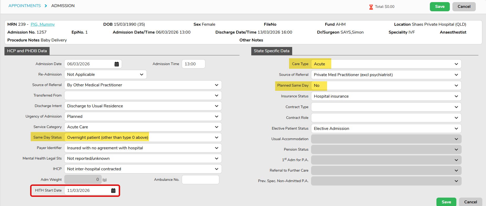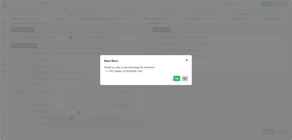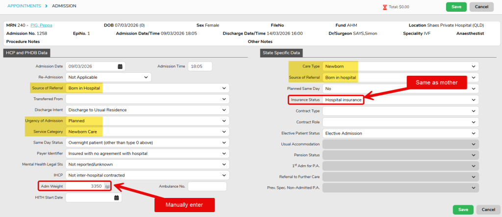 📝Currently only QLD facilities will have below highlighted fields pre-populated for newborn admissions; other state will need to manually assign the relevant values.