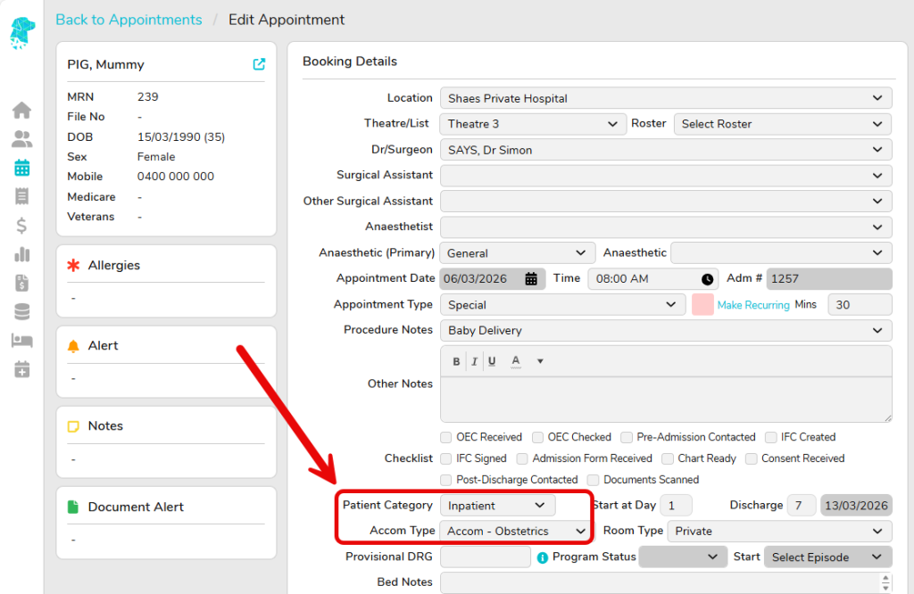 - Select the appropriate Patient Category & Accom Type