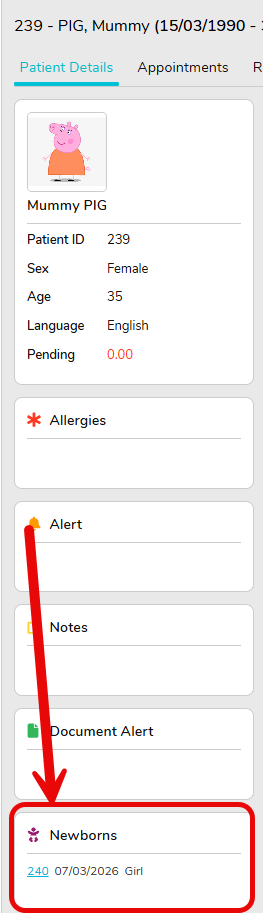 Newborns must be registered as separate patient records and linked to the mother.