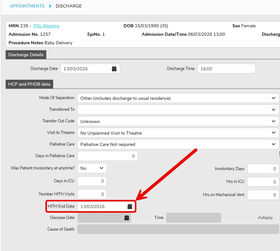 - Entering Hospital in the Home (HITH) details where applicable