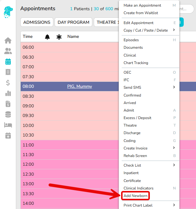- From the mother’s appointment, Right Click > add Newborn (or create a new patient manually)