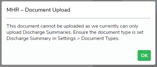 Attempting to upload a document that is not assigned a MHR Template type of ‘Discharge Summary’ will trigger an alert message. Only Discharge Summaries can be uploaded to MHR through FYDO.