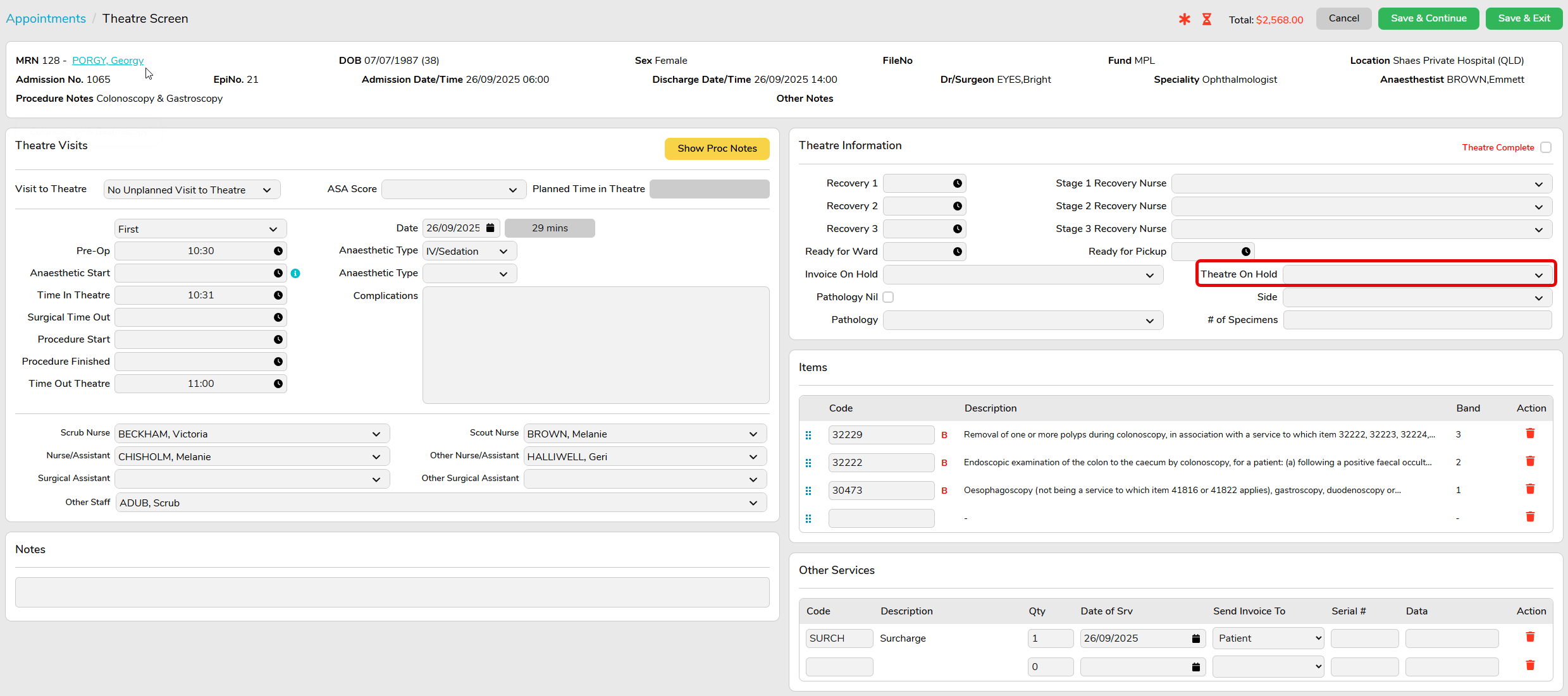 For many disciplines, coding may be impacted by pathology results, or awaiting doctor verification of items performed. If coding is on hold, please designate a Theatre on Hold reason (e.g. Pending Pathology, Awaiting Item Numbers, etc) in the Theatre Screen. (Additional reasons can be added in Settings > Theatre Hold Reasons.)
