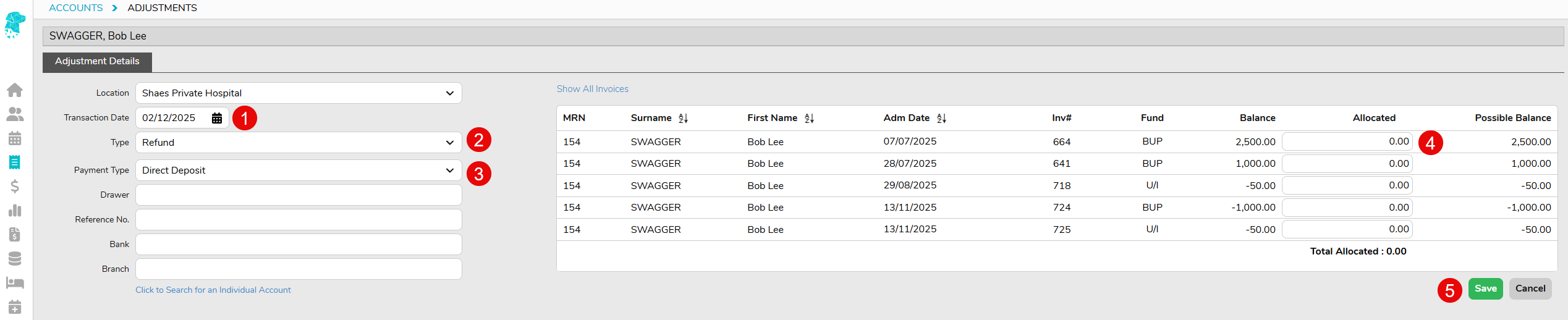 - The Payment Type field is displayed allowing the facility to record how the refund was processed.